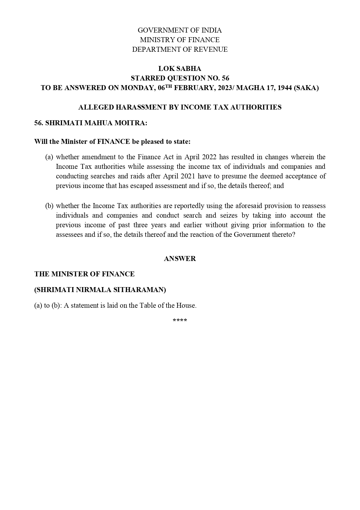 Smt. Nirmala Sitharaman Hon'ble Finance Minister explains new scheme under section 148 of the Income Tax Act, 1961 for search and seizure cases in LOK SABHA: