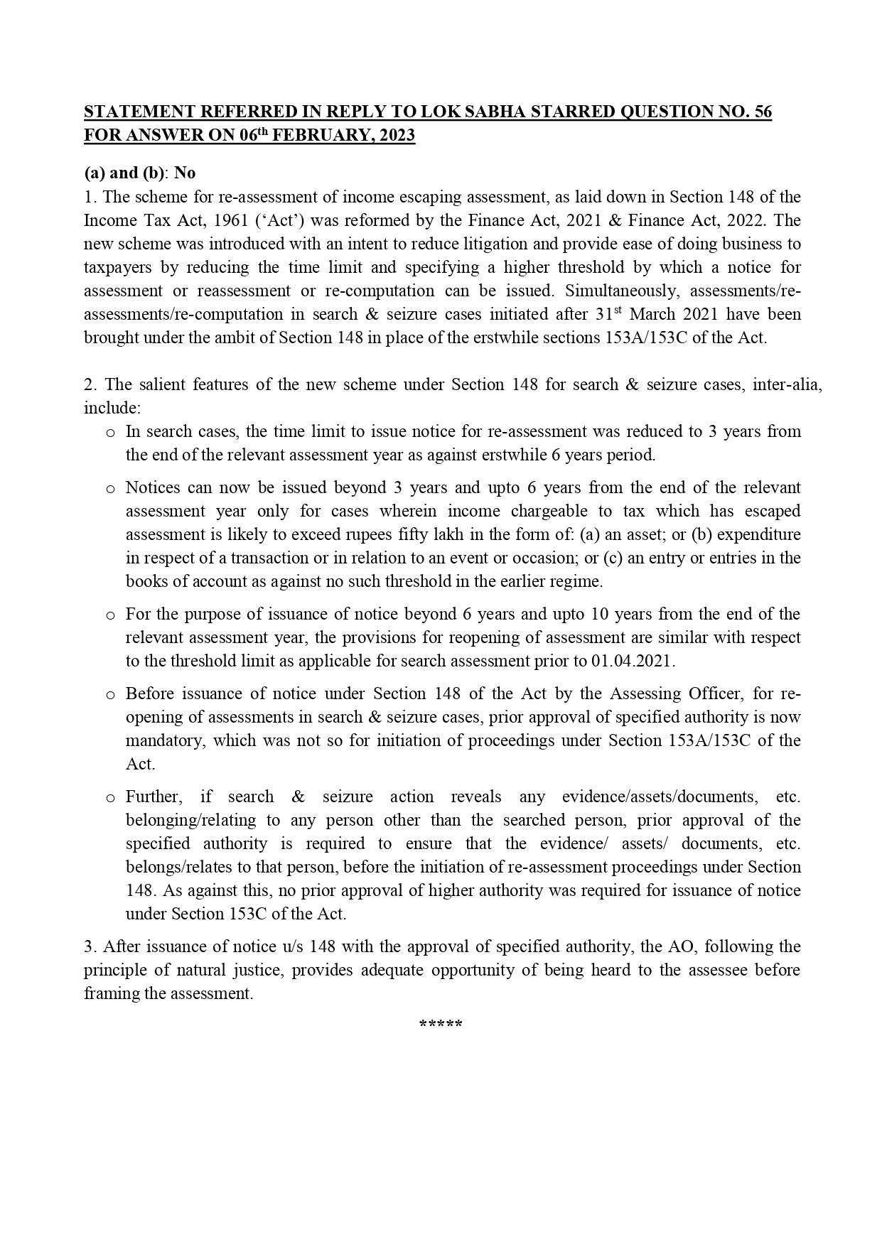 Smt. Nirmala Sitharaman Hon'ble Finance Minister explains new scheme under section 148 of the Income Tax Act, 1961 for search and seizure cases in LOK SABHA: